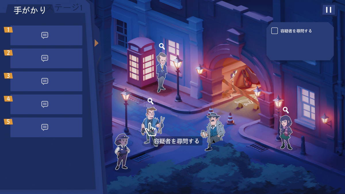 容疑者をクリックで尋問。ダブルクリックで手がかりを入手。