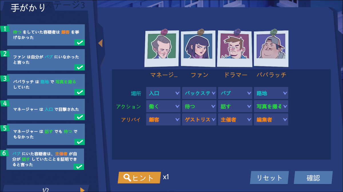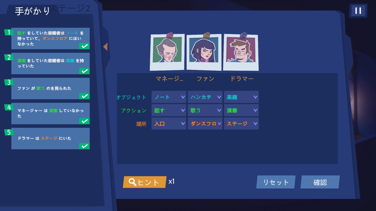 全部の証拠がでたら、容疑者の特定画面へ移動。ヒントもあります!