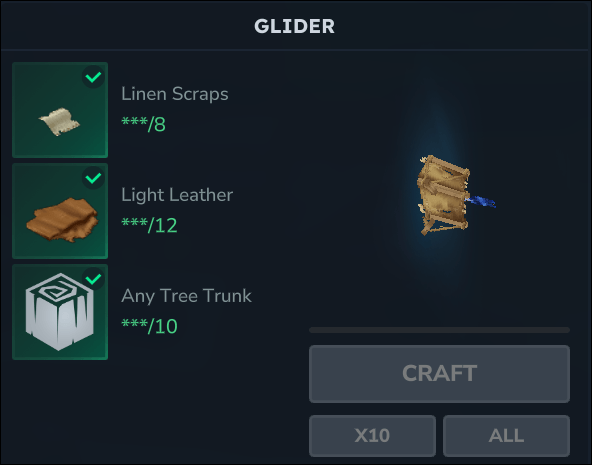ゲームファイル内に存在するグライダーをクラフト可能にします。高所からの滑空移動が可能になります。
