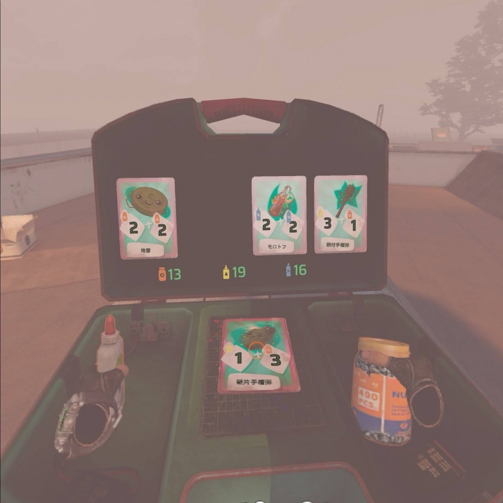 バッグをあけて、作りたいカードを中心へ置きます。材料がそろっていれば、両サイドに材料が出るのでそれをつかんでカード上で?手と手をぶつけるようなしぐさをするとアイテムが生成されます。