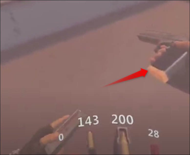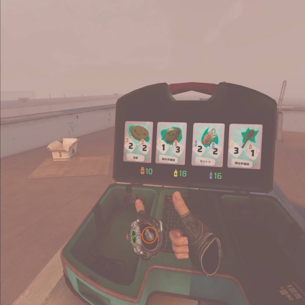 前作と同じく、手の裏側に格納することができます。手りゅう弾は取り出してピンを抜く動作をしてから投げます。火炎瓶は投げた後に銃で撃つと燃えます。